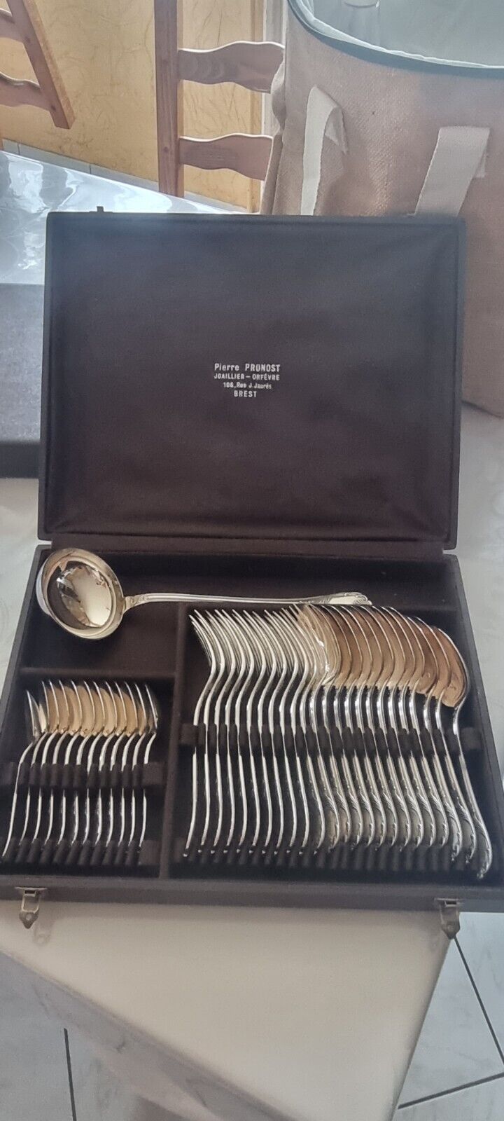 Ensemble de coutellerie CHRISTOFLE prestigieux composé de 37 pièces au modèle MARLY, réalisé en métal argenté de qualité supérieure. Cette ménagère complète regroupe fourchettes et cuillères assorties, témoignant du savoir-faire intemporel de la manufacture française. L'état de conservation est remarquable, rehaussé par la présence de la facture d'achat originale attestant son authenticité et son provenance. Une pièce de collection idéale pour les amateurs de vaisselle de prestige et de design classique.