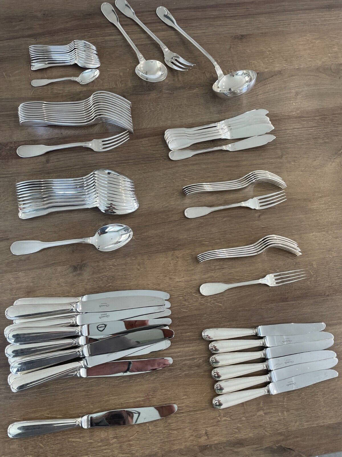Prestigieuse ménagère Christofle Versailles composée de 75 pièces en métal argenté, tous les éléments portent le poinçon authentique de la manufacture. Cet ensemble complet comprend 12 fourchettes de table (20,5 cm), 12 couteaux à viande (24 cm), 12 grandes cuillères (20,5 cm) et 12 petites cuillères (13,5 cm). S'ajoutent 6 couverts entremet, 6 couverts à poisson, ainsi qu'une louche, une cuillère et une fourchette de service. L'argenture conserve son éclat d'origine sans désargentage, témoignant d'un entretien exemplaire. Une pièce de référence pour les collectionneurs de vaisselle de prestige.