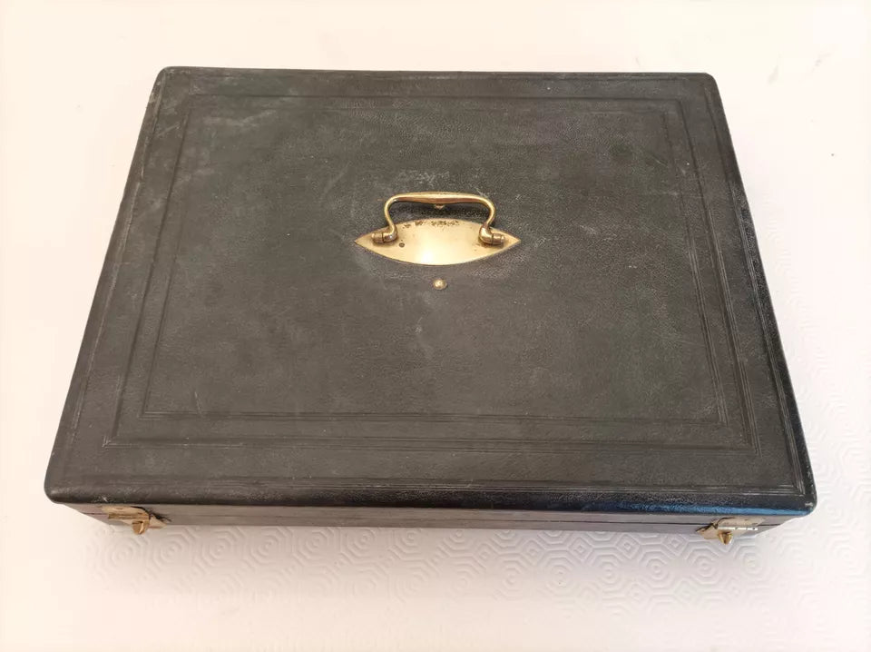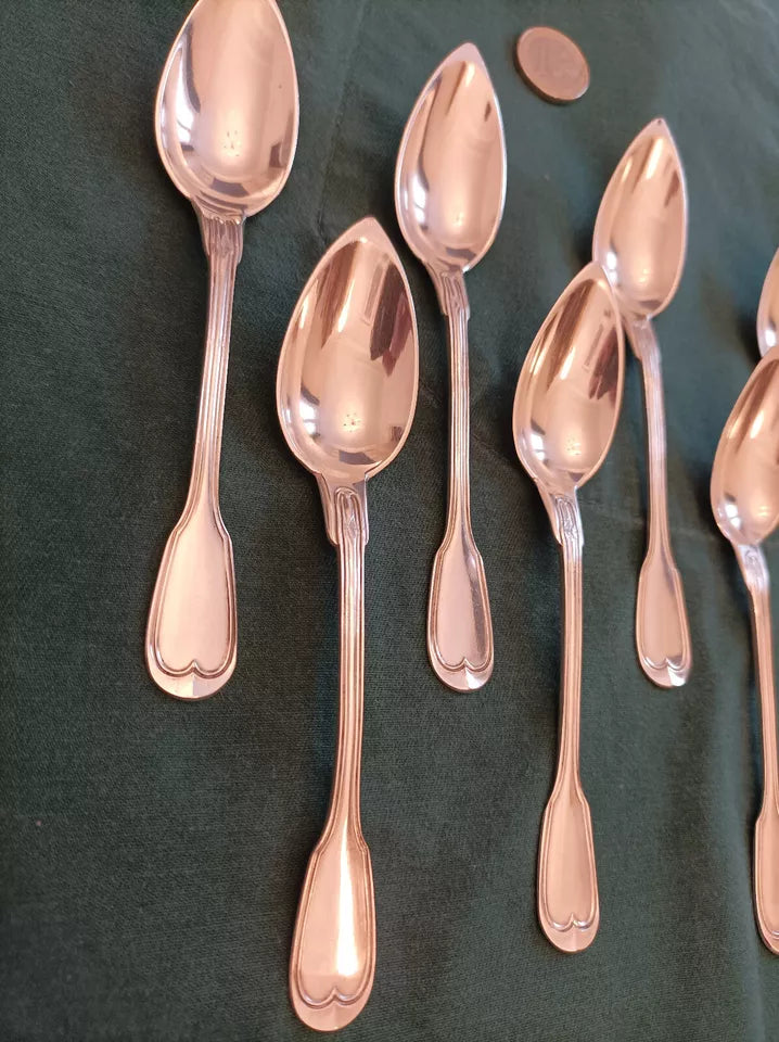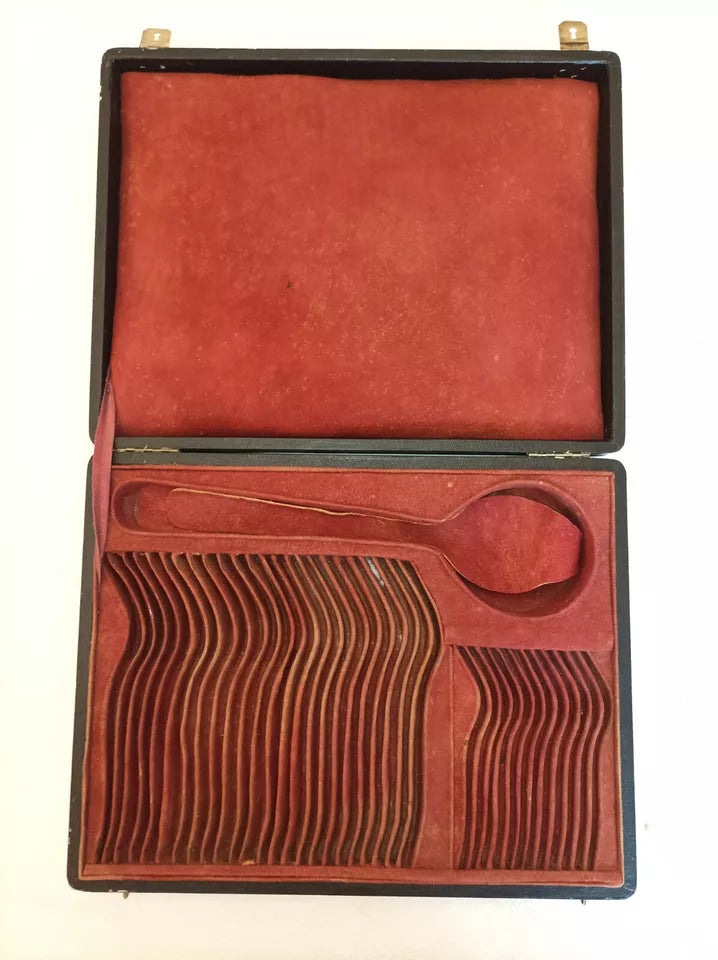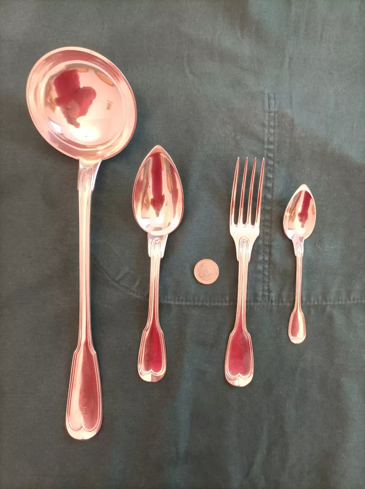 Ensemble de ménagère en argent massif aux poinçons Minerve (925/1000), composé de 37 pièces : une louche, douze fourchettes de table, douze cuillers à soupe et douze petites cuillers. Travail des orfèvres parisiens Hénin et Thomas (1861-1865), modèle filet. Poids total 2,474 kg. Présenté dans son coffret d'origine en cuir avec intérieur feutré et ferrures en laiton. État remarquable pour un ensemble datant de 160 ans : cuir d'époque préservé, couverts portant légères traces d'usage. Deux petites cuillers légèrement déformées, facilement redressables. Pièce de collection authentique pour les amateurs d'argenterie ancienne.