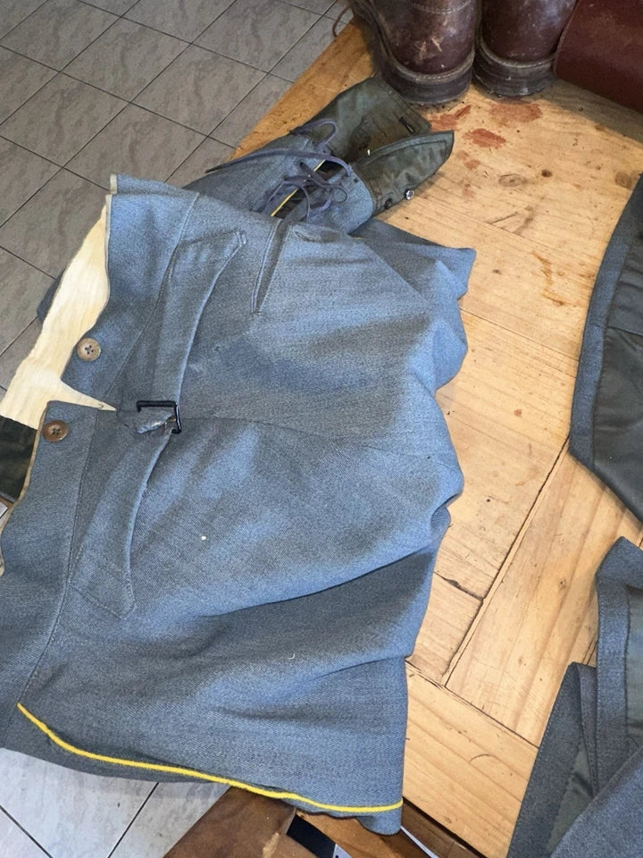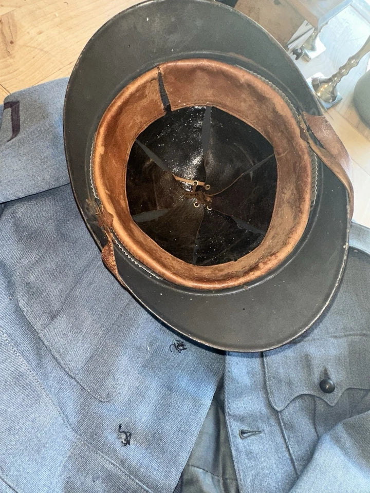 Uniforme militaire français de la Première Guerre mondiale, découvert dans une malle de grenier. Cet ensemble complet comprend tous ses accessoires d'origine et conserve l'authenticité de sa confection Burberry. L'uniforme présente quelques traces mineures d'usure temporelle, à peine visibles. Les boutons de remplacement sont fournis dans les poches et nécessitent simplement d'être recousus. Une pièce historique remarquablement préservée pour les collectionneurs et passionnés d'histoire militaire.
