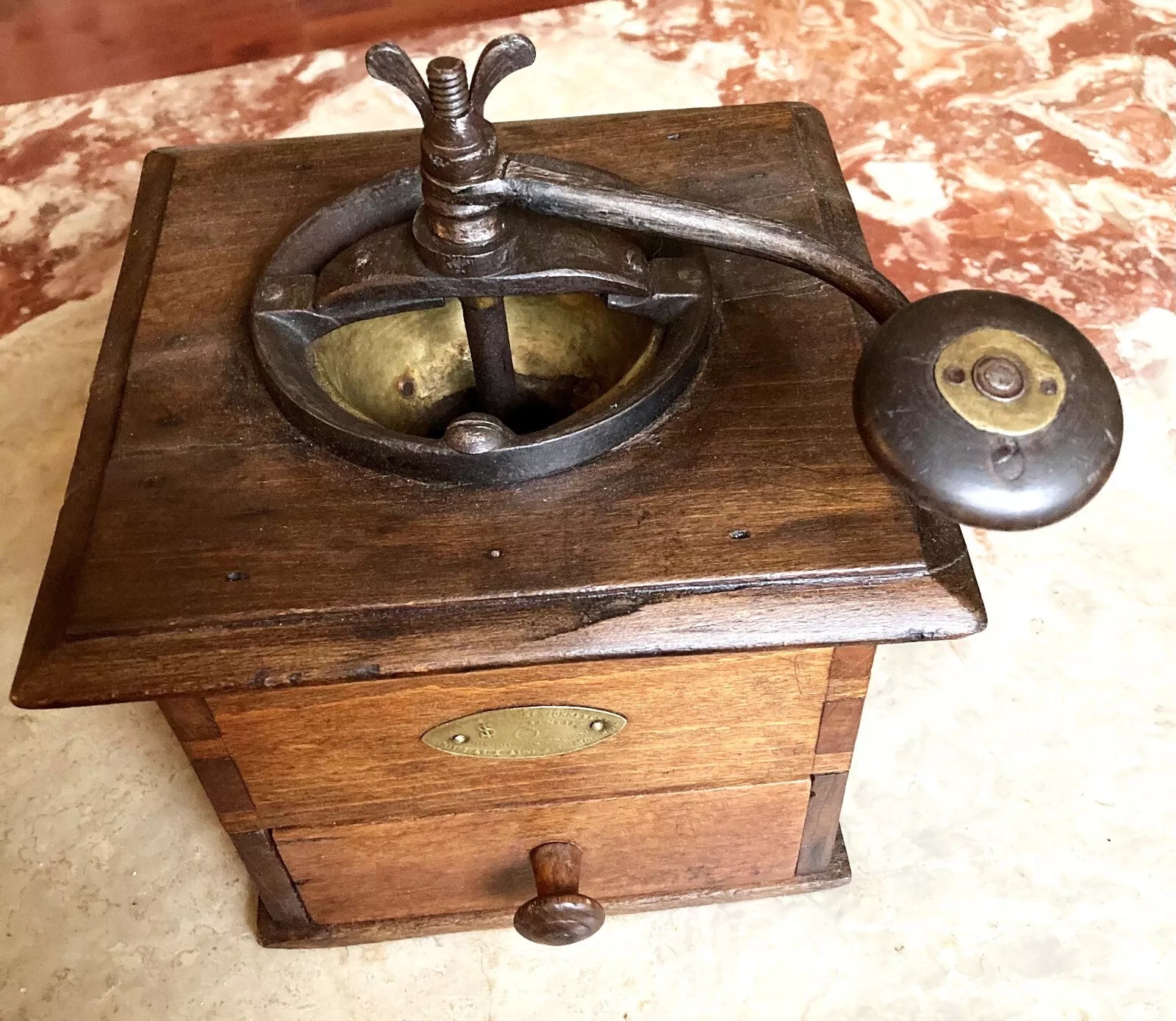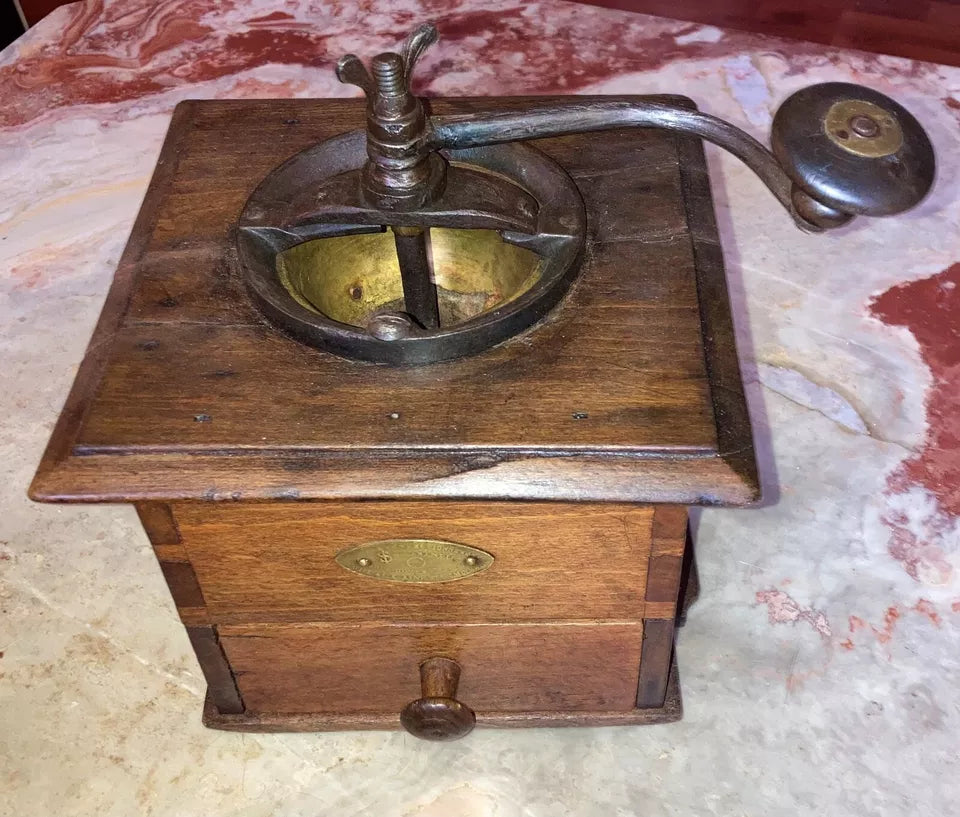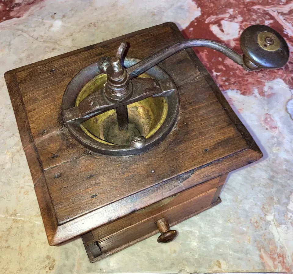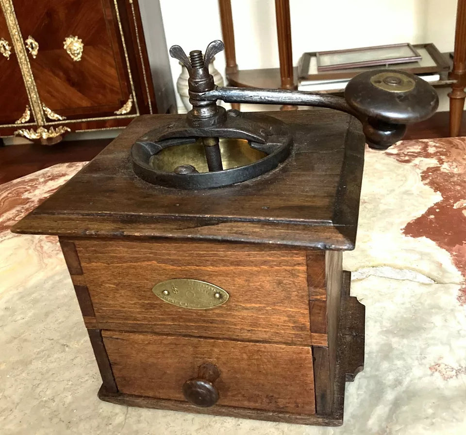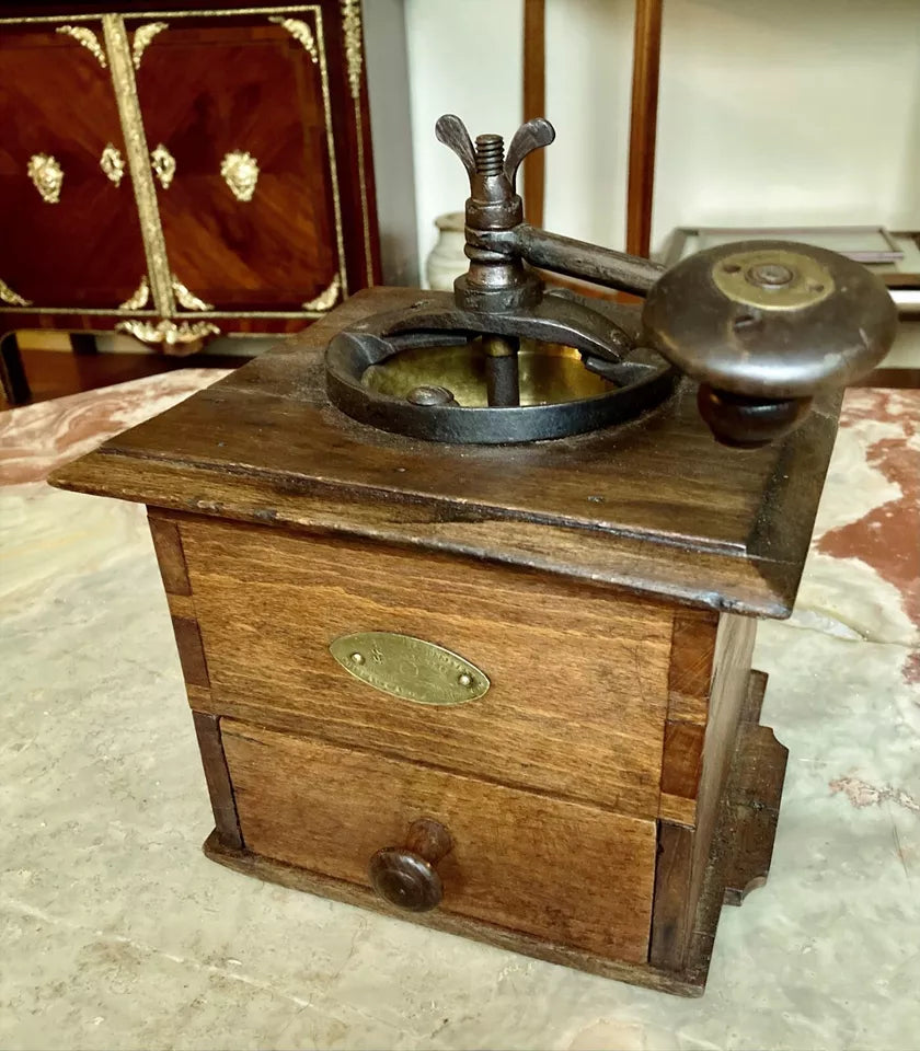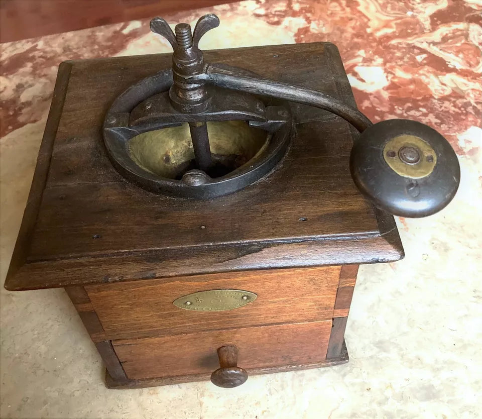 Découvrez ce remarquable moulin à café de comptoir Coulaux, une pièce de collection prisée des connaisseurs. Cet exemplaire de grand format conjugue l'authenticité d'un objet d'époque avec une construction robuste en métal et bois. Ses dimensions généreuses (24 cm de hauteur, base 17 × 20 cm) en font un élément de décoration imposant. La patine d'origine et le mécanisme visible avec manivelle d'époque témoignent de son intégrité historique. Un incontournable pour les collectionneurs d'ustensiles vintage et les passionnés d'objets d'exception.