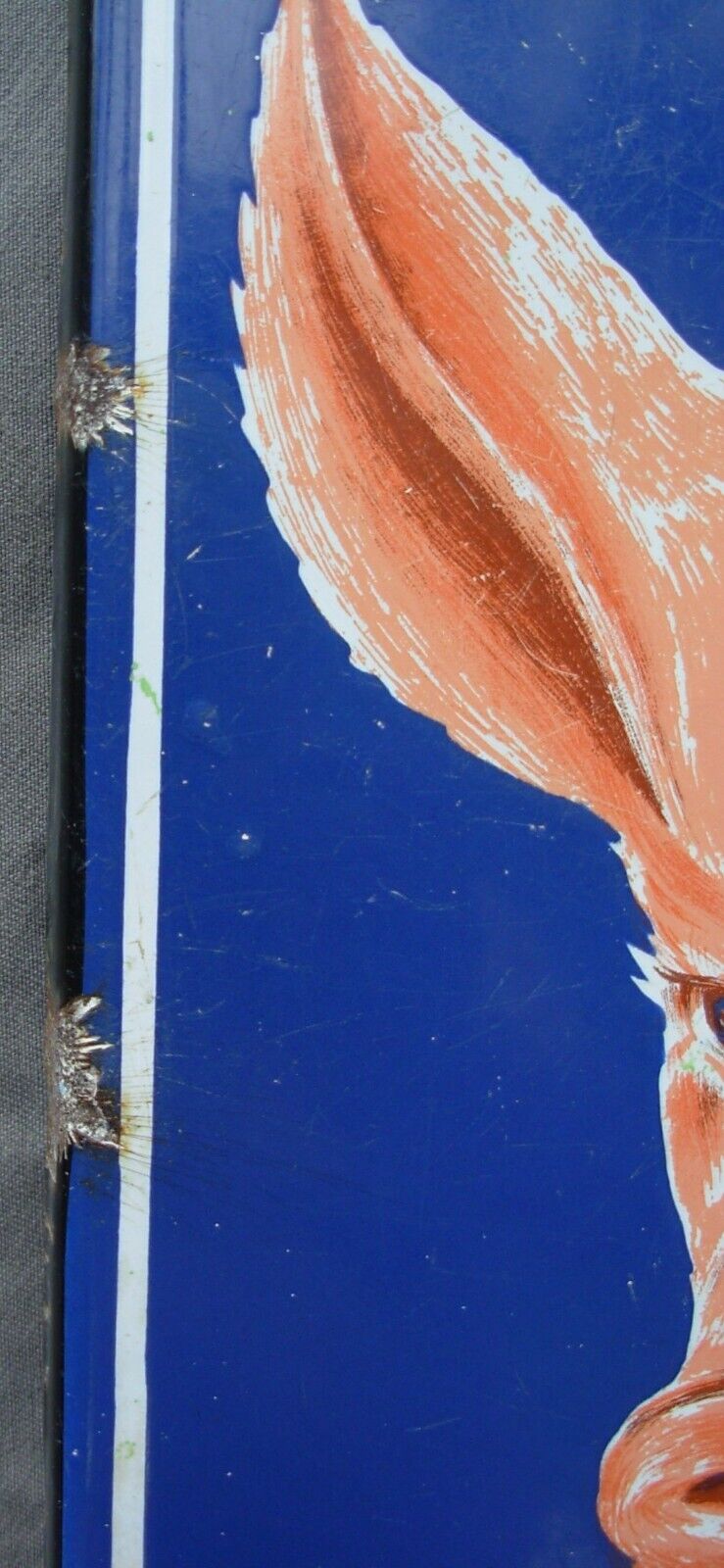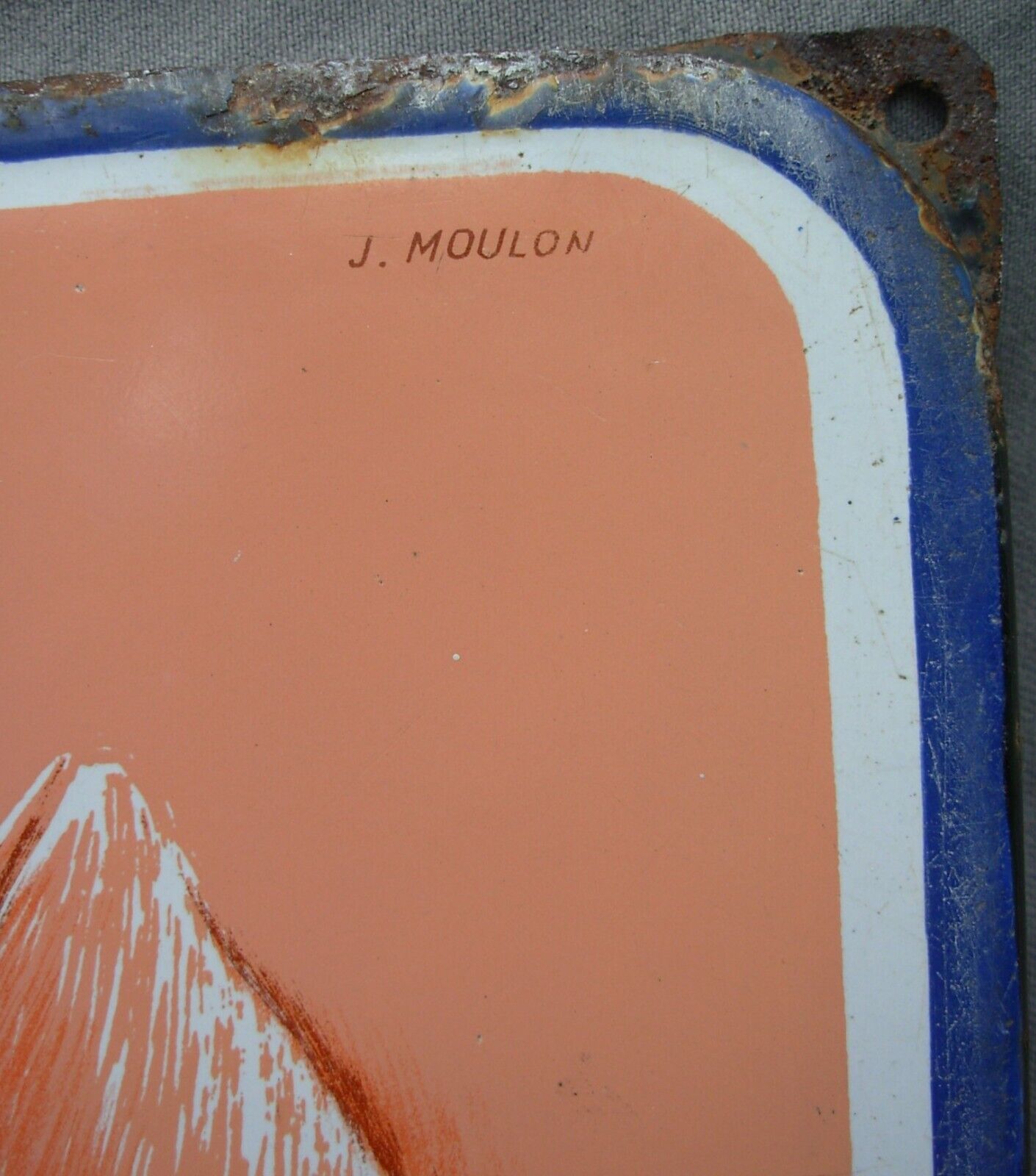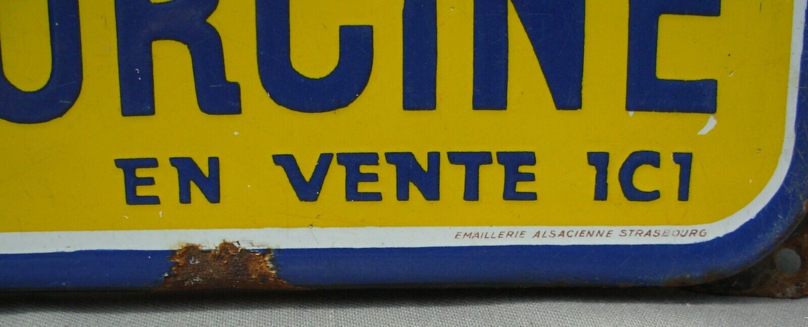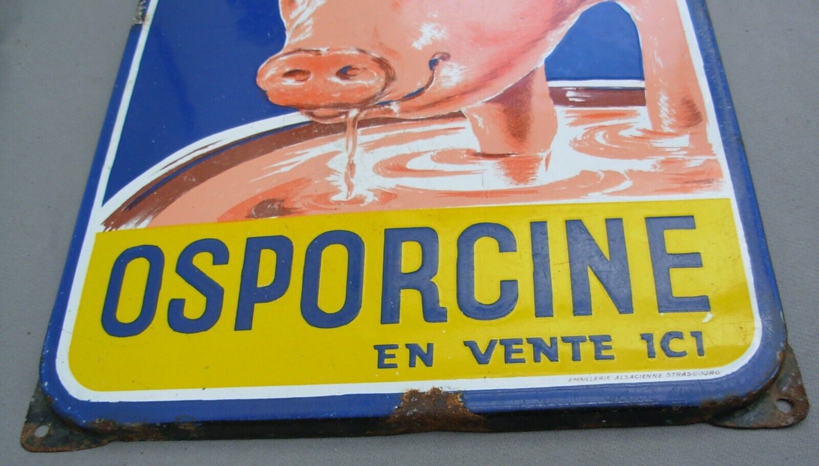 Plaque émaillée publicitaire OSPORCINE de facture authentique, signée J. Moulon et produite par l'Emaillerie Alsacienne de Strasbourg. Dimensions : 48 x 30 cm. Cette pièce historique porte les marques du temps avec distinction : impacts et rayures témoignent de son exposition prolongée aux intempéries, tandis que des résidus de ciment subsistent au revers. Malgré ces altérations naturelles, la plaque conserve une belle patine d'usage et demeure un exemplaire remarquable de la signalétique commerciale du XXe siècle, reflétant l'excellence de l'émaillerie strasbourgeoise.