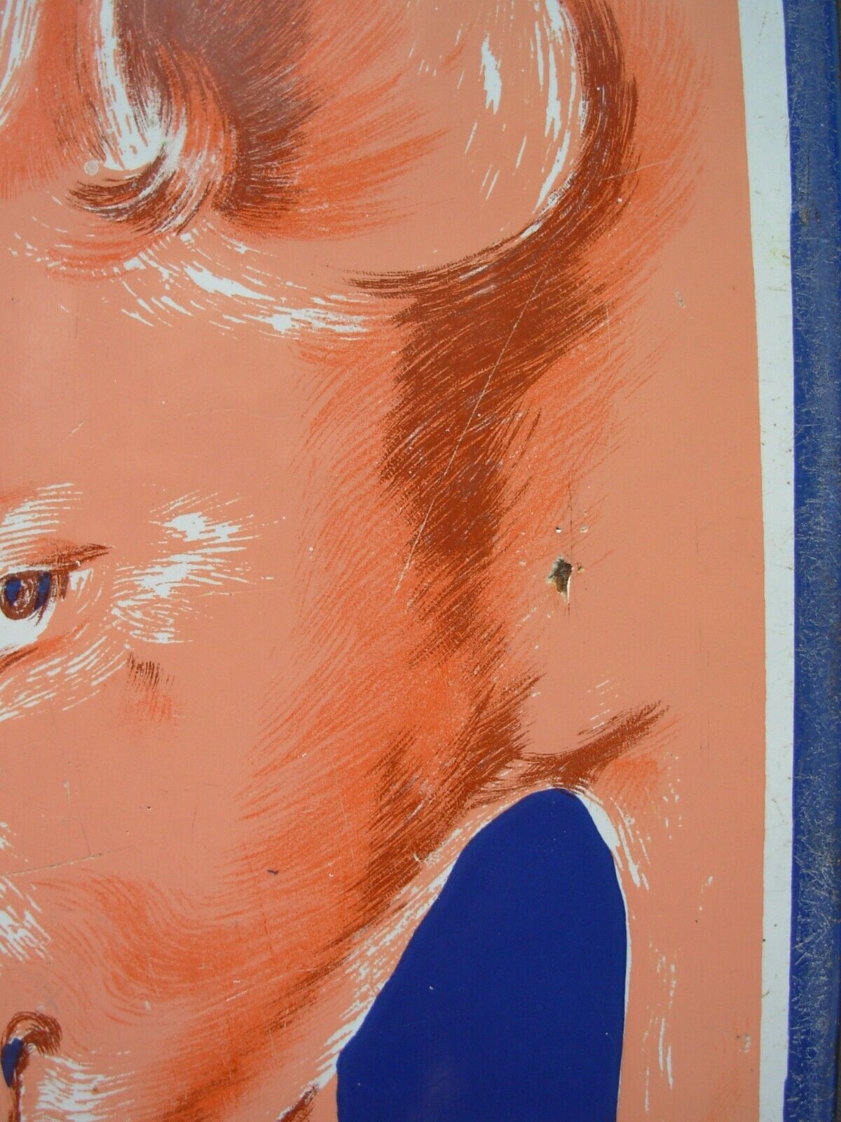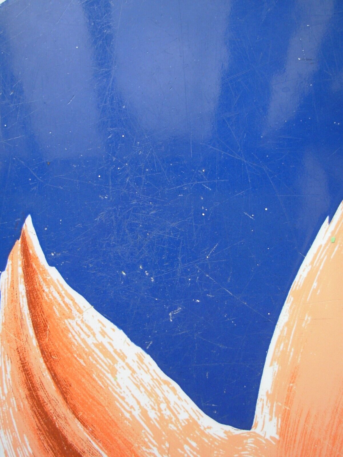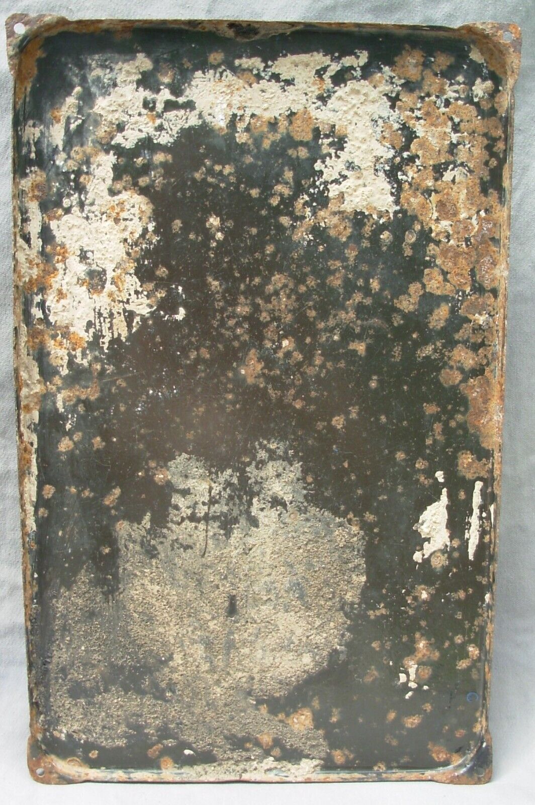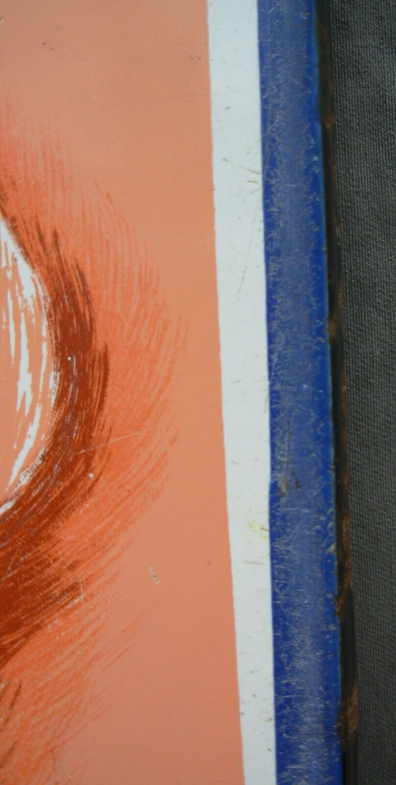 Plaque émaillée publicitaire OSPORCINE de facture authentique, signée J. Moulon et produite par l'Emaillerie Alsacienne de Strasbourg. Dimensions : 48 x 30 cm. Cette pièce historique porte les marques du temps avec distinction : impacts et rayures témoignent de son exposition prolongée aux intempéries, tandis que des résidus de ciment subsistent au revers. Malgré ces altérations naturelles, la plaque conserve une belle patine d'usage et demeure un exemplaire remarquable de la signalétique commerciale du XXe siècle, reflétant l'excellence de l'émaillerie strasbourgeoise.