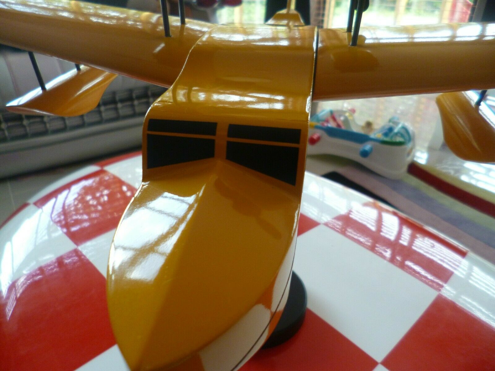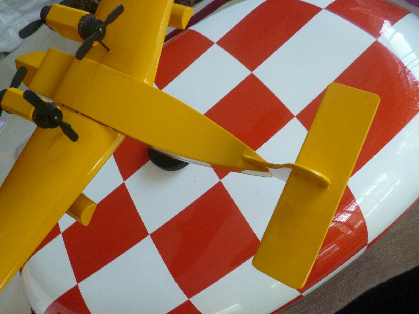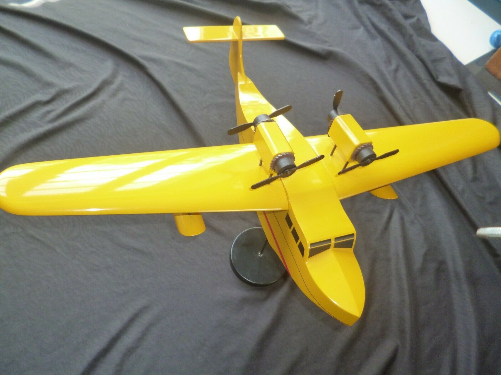 Figurine d'avion Tintin de collection signée Aroutcheff, représentant un hydravion bimoteur en bois polychrome de la première édition 1986. Cette pièce vintage affiche un excellent état de conservation avec sa pastille d'authentification d'origine sous la base. Avec une envergure d'environ 60 cm, ce modèle constitue une acquisition remarquable pour les collectionneurs de jouets anciens et de bandes dessinées. Détails de fabrication soignés et patine caractéristique de l'époque.