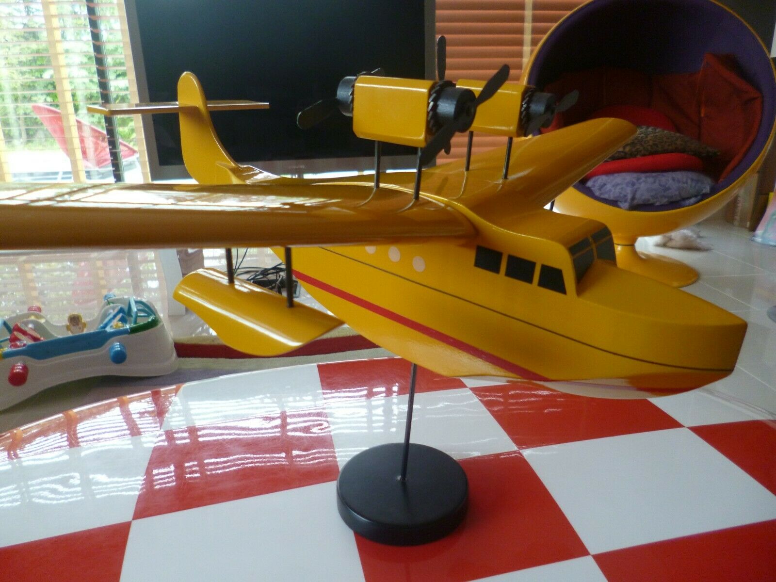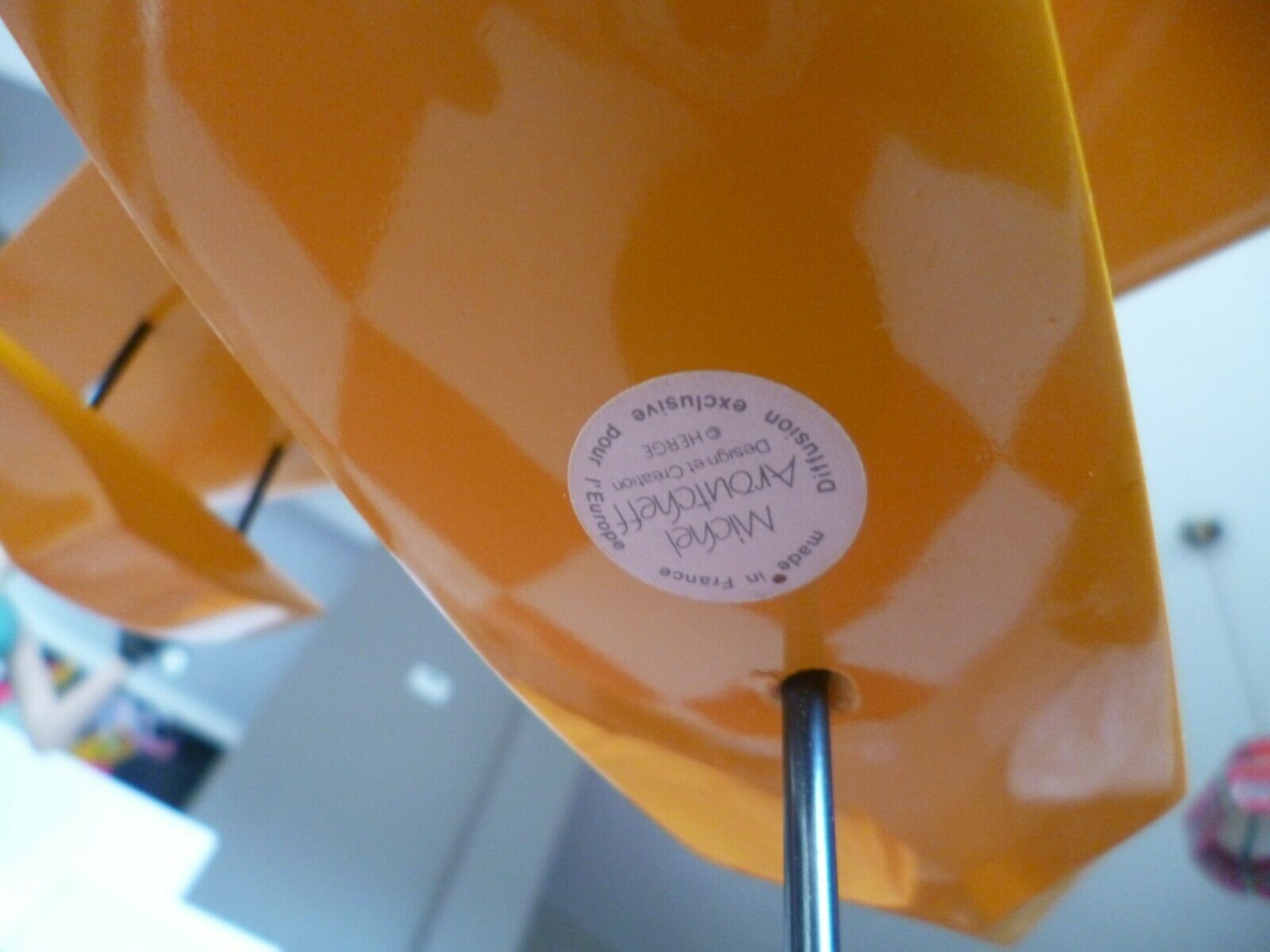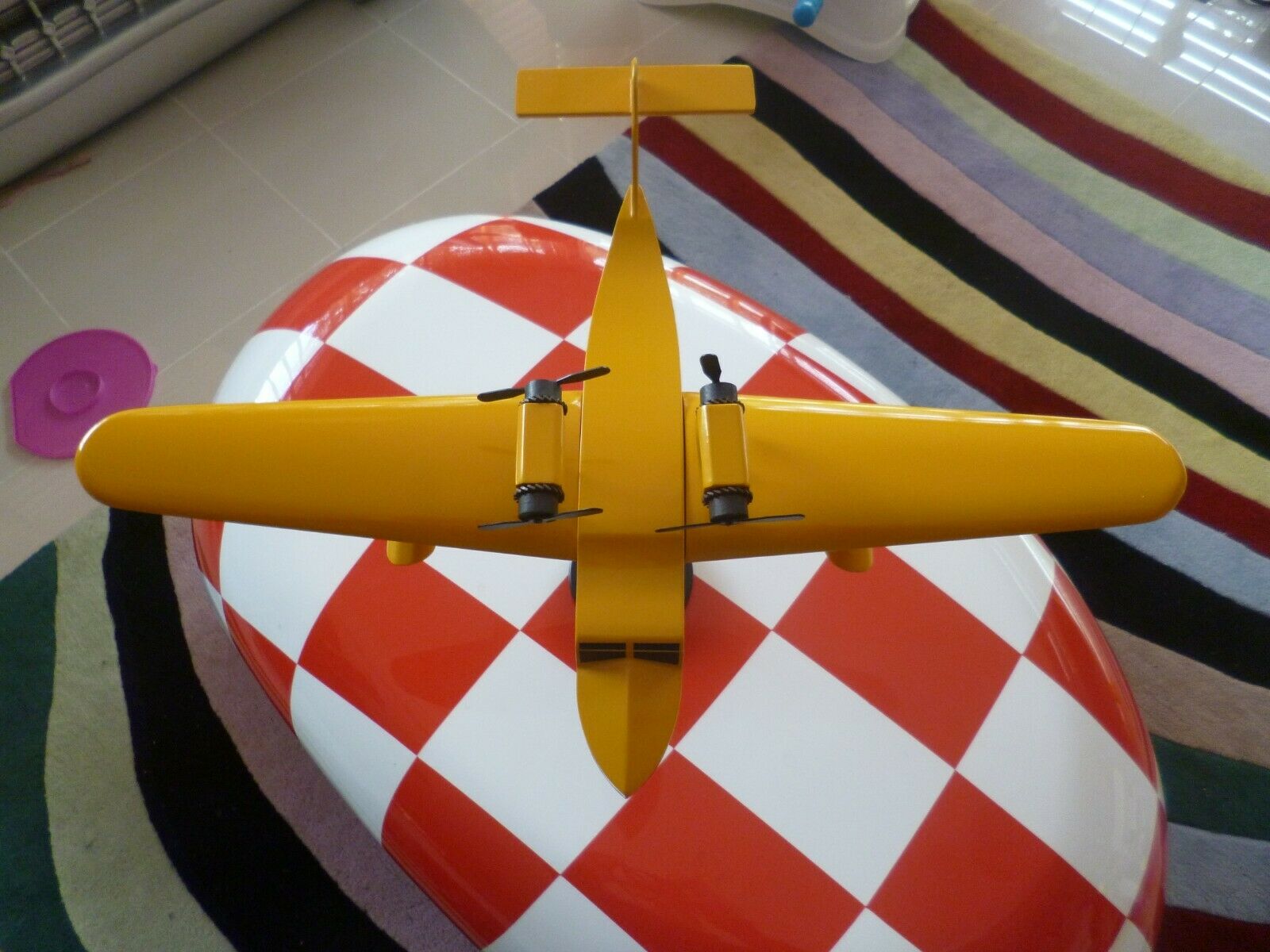 Figurine d'avion Tintin de collection signée Aroutcheff, représentant un hydravion bimoteur en bois polychrome de la première édition 1986. Cette pièce vintage affiche un excellent état de conservation avec sa pastille d'authentification d'origine sous la base. Avec une envergure d'environ 60 cm, ce modèle constitue une acquisition remarquable pour les collectionneurs de jouets anciens et de bandes dessinées. Détails de fabrication soignés et patine caractéristique de l'époque.